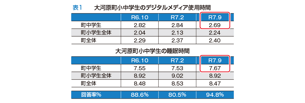 植松先生の助言を受け、過去2年間でメディア使用と睡眠に絞ったアンケートを3回実施しました(表1)。令和7年2月と9月を比べると、中学生のメディア使用時間は1日平均2.84時間から2.69時間に減少し、睡眠時間は7.53時間から7.67時間へとわずかに増えています。ただ、生活習慣の改善は簡単ではなく、継続した取り組みが必要だと実感しています。