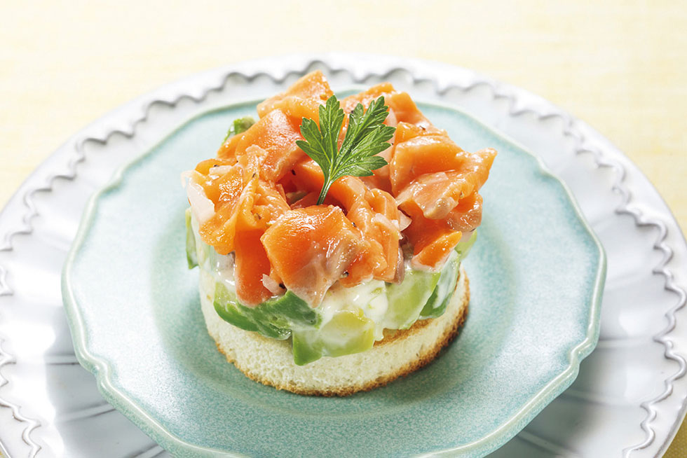 ❷ サーモンは1cm角に切り、🅐と混ぜておく。