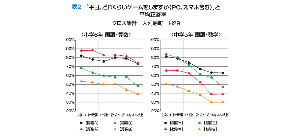 平成29年度には、全国学力・学習状況調査とゲーム時間の関係を調査しました(表2)。ゲームを1日4時間以上行うと、学力が15〜20%ほど下がる傾向にあり、特に中学生で顕著でした。